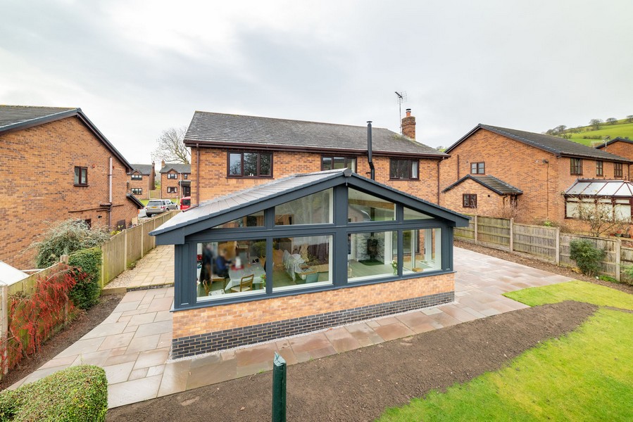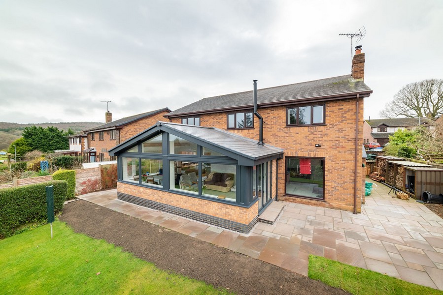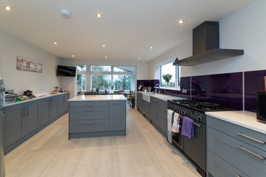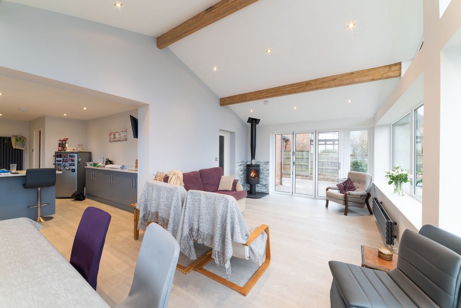 Project info: Single storey pitched extension to rear with a glazed gable and bi-folding doors, internal alterations and new kitchen installed. Decorative oak purlins and wood burning stove installed, external flagging carried out and a soakaway was also installed.